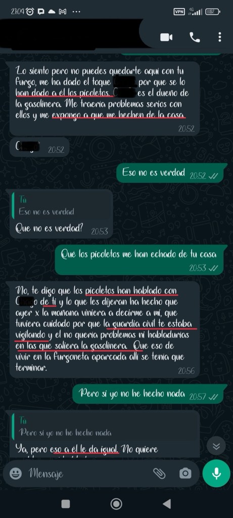 El contexto de la historia comienza la noche en la que mi acosador decide meterse con su furgoneta en mi calle sin salida, obviamente, para saber si estoy o no estoy allí. Ese día yo me encontraba en mi furgo escondida y lo único que se me ocurrió para defenderme fue arrancar el coche… no olvidaré jamás la prisa que se dio en salir de allí a toda castaña.